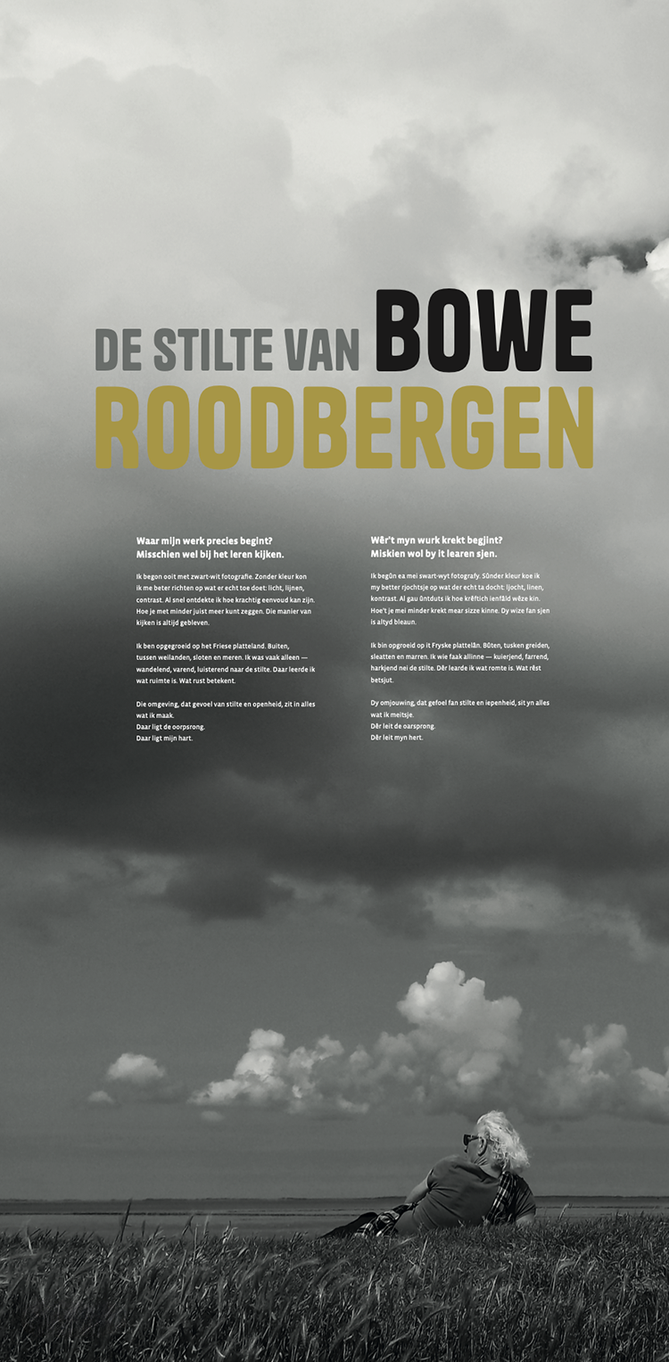 “De stilte extra hoorbaar maken”. Zo typeerde Bowe de essentie van zijn werk. Hier raken meteen leven en werk elkaar in de kern. Inspiratie vond hij vaak dicht bij huis: op het Friese platteland. Op 24 juni 2024 is Bowe Roodbergen tijdens een bergwandelvakantie in Andorra verongelukt.